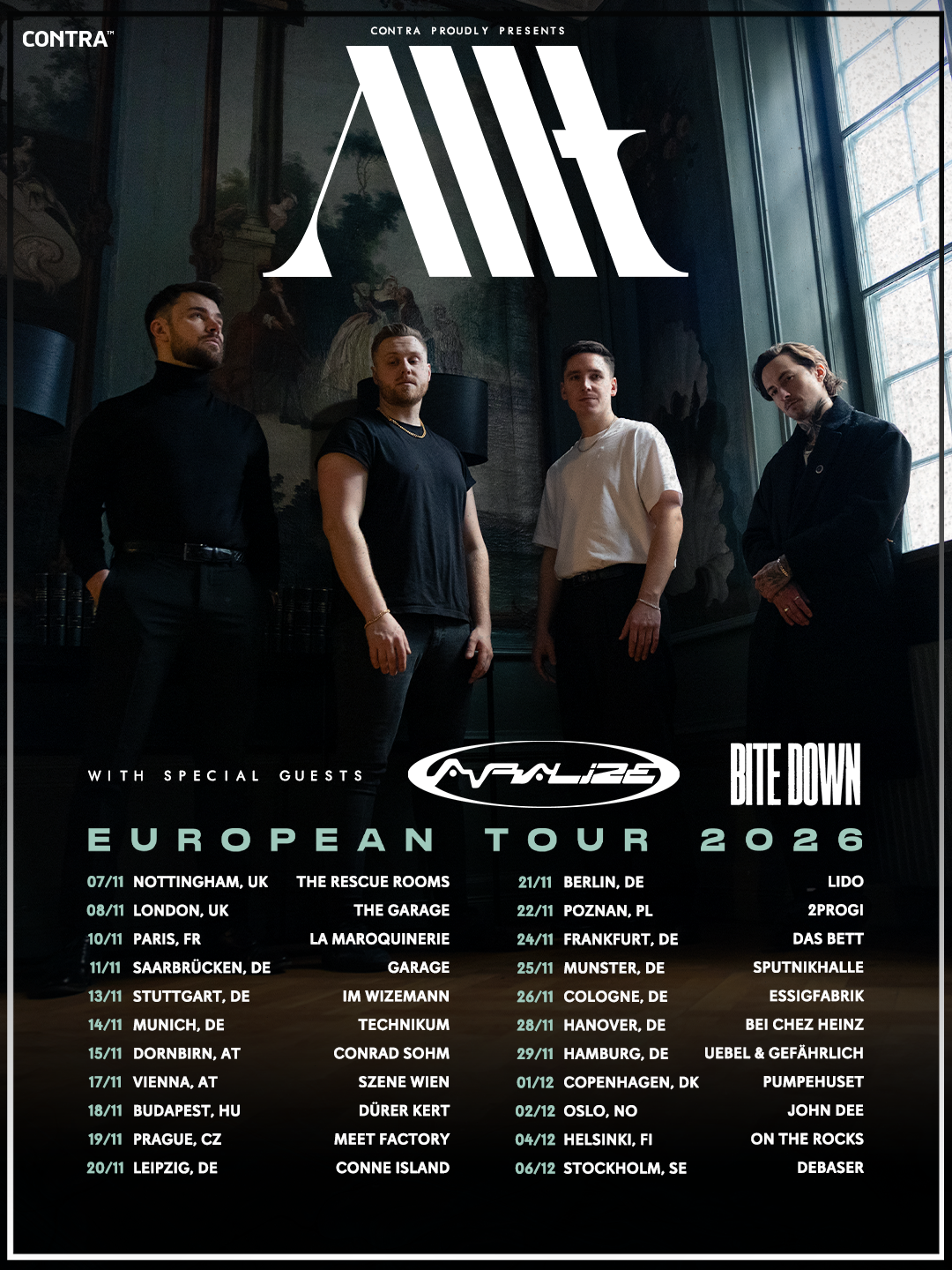 Nach einem intensiven Festivalsommer kehren Allt im Winter 2026 für eine umfangreiche Europatour zurück. Diese Tour steht für eine neue Phase der Band. Größer angelegt, inhaltlich verdichtet und mit einer Produktion, die die visuelle und musikalische Ebene enger miteinander verbindet als zuvor.