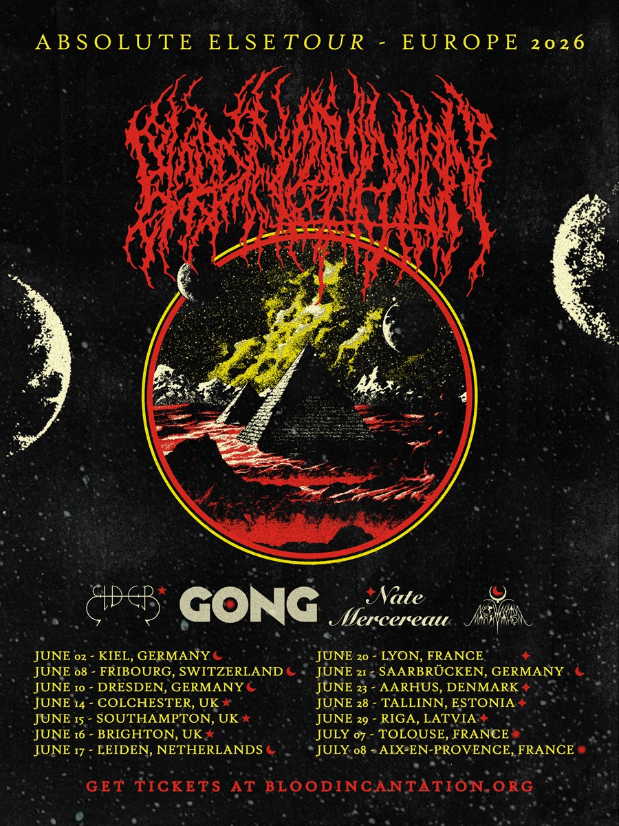 As Blood Incantation’s Paul Riedl tells, “‘Absolute Elsewhere’ is our most potent audial extract/musical trip yet; like the soundtrack to a Herzog-style Sci-Fi epic about the history of/battle for human consciousness itself, via a 70s Prog album played by a 90s Death Metal band from the future.” For inspiration, the group looked to the mid-70’s progressive rock collective, Absolute Elsewhere (best known as a celestial stopover for King Crimson drummer, Bill Bruford) as the album’s namesake. For the uninitiated, Absolute Elsewhere’s obscure 1976 album, In Search of Ancient Gods, was constructed as a musical accompaniment to the works of Chariots of the Gods author, Erich Von Daniken, and his theories of non-terrestrial humanoid prompts towards mankind’s evolution. The subject matter of which should serve as no surprise to anyone familiar with Blood Incantation’s cosmically philosophical leanings. But make no mistake, the four musicians working under the Blood Incantation banner for the past decade – guitarist and vocalist Paul Riedl, drummer Isaac Faulk, guitarist Morris Kolontyrsky and bassist Jeff Barrett – have successfully left the microgravity of genre behind and are re-writing the Rosetta Stone of extreme music with a new language entirely. Demonstrations like their 2022 all-synth show or 2024’s Roadburn Festival headlining appearance where they played back-to-back death metal and ambient made it clear: Blood Incantation have honed their abilities to go boldly where few bands have gone before, and reveal no signs of slowing down.