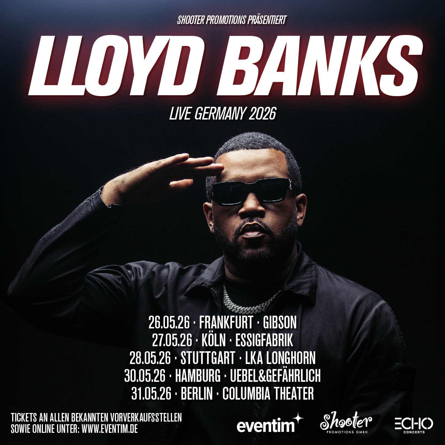 Im 2026 kommt der Hip-Hop Künstler LLOYD BANKS für live Shows nach Deutschland. Der Rapper bringt seine Beats, eine Mischung aus Hip-Hop und R&B, auch nach Hamburg.