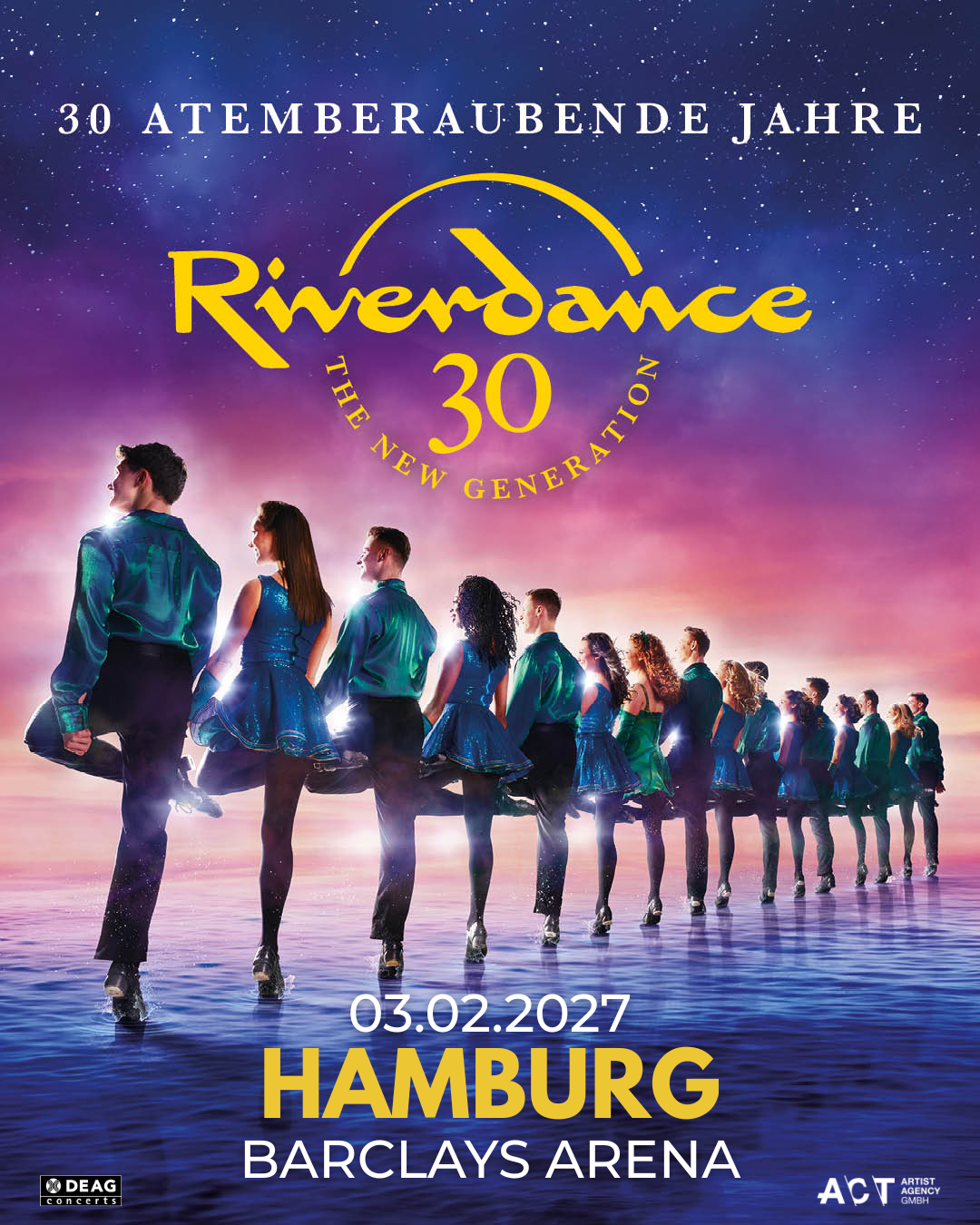 Ein weltweites Phänomen, 30 atemberaubende Jahre, 30 Shows 2027 hierzulande, in Österreich und in der Schweiz: Riverdance! Im Frühjahr 2027 ist die spektakuläre irische Tanzshow auf ihrer internationalen Jubiläumstour auch in Berlin, Hamburg, München, Köln sowie in 26 weiteren Städten live zu erleben! Der Tournee-Titel „Riverdance 30 – The New Generation“ verweist auf die Generation der Tänzerinnen und Tänzer der Jubiläumsproduktion, die nach 1995 geboren wurde und mit Riverdance aufgewachsen ist. Diese neue Generation talentierter, leidenschaftlicher junger Darstellerinnen und Dartseller trägt die Magie der Originalshow, die das Publikum weltweit seit Jahrzehnten begeistert, 2027 mit neuen Choreografien und Kostümen sowie exzellenter Performance in die Zukunft.